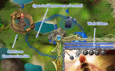 See in this example if you had built the Ord Stone inside your area of control it would have completed instantly. Instead you placed it outside and now it will take 4 rounds to finish the building.