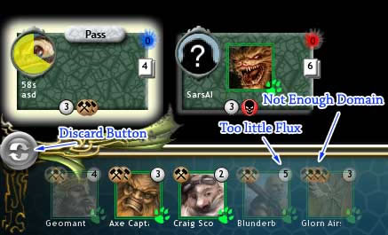 Here you can see an example of cards in your hand. You can tell form your Player Status that you have 3 Flux and Level 2 Mountain Folk Domain. This allows you to play either of the un-greyed cards, the Axe Captain or the Craig Scout. The others either require too much flux or too high a domain level for you to use.